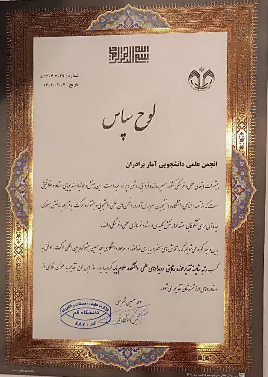 کسب رتبه شایسته تقدیر توسط انجمن علمی آمار برادران در جشنواره حرکت دانشگاه قم